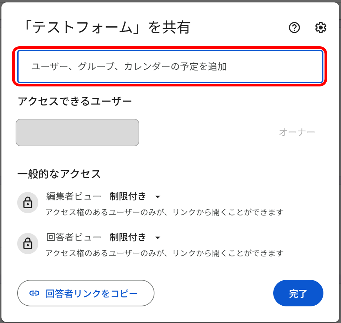 - 画面右上の「共有」をクリックして、「ユーザー、グループ、カレンダーの予定を追加」の欄に、