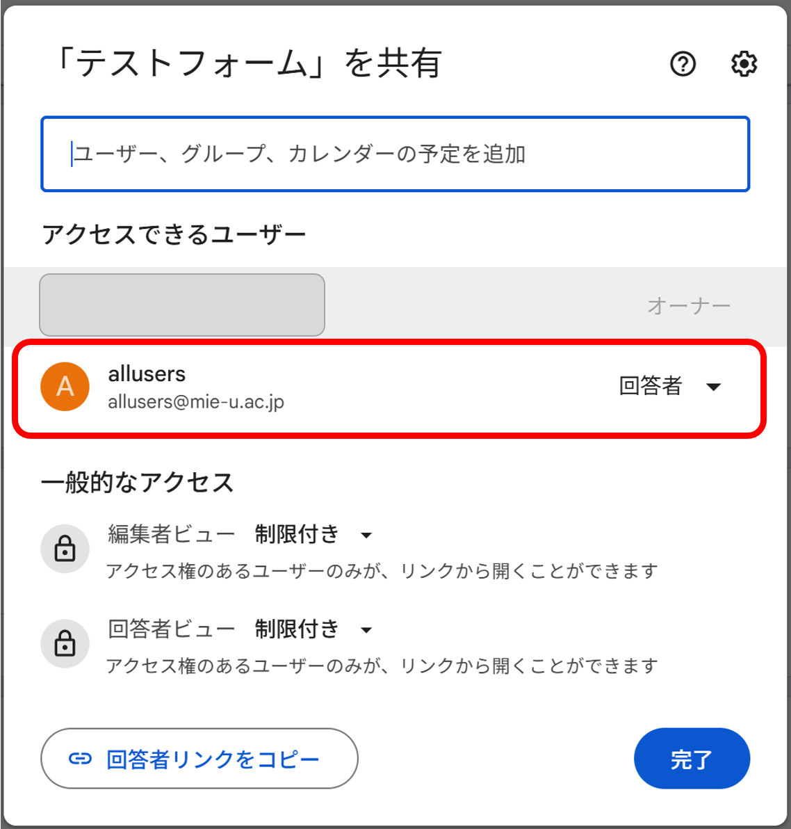 三重大学Sansuiアカウントにてフォームを作成し、回答者ビューにて「三重大学(Sansui)」を選択した場合、三重大学Sansuiアカウントを持っている人のみフォームに入力できます。