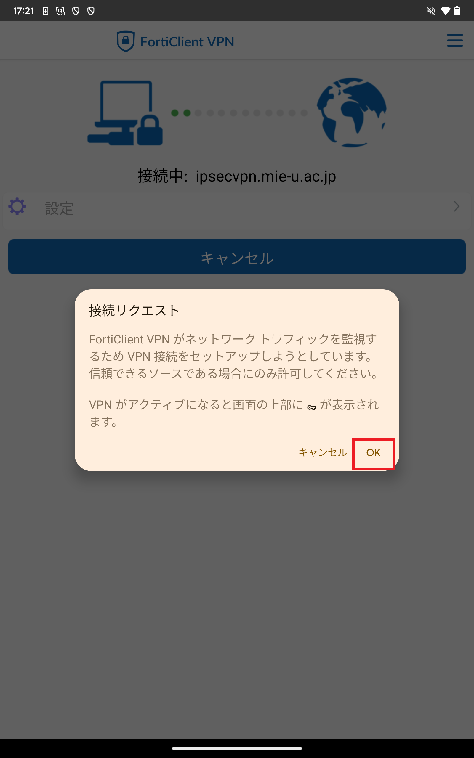- セキュアVPNが接続されました。学内制限ページが見られるかご確認ください。