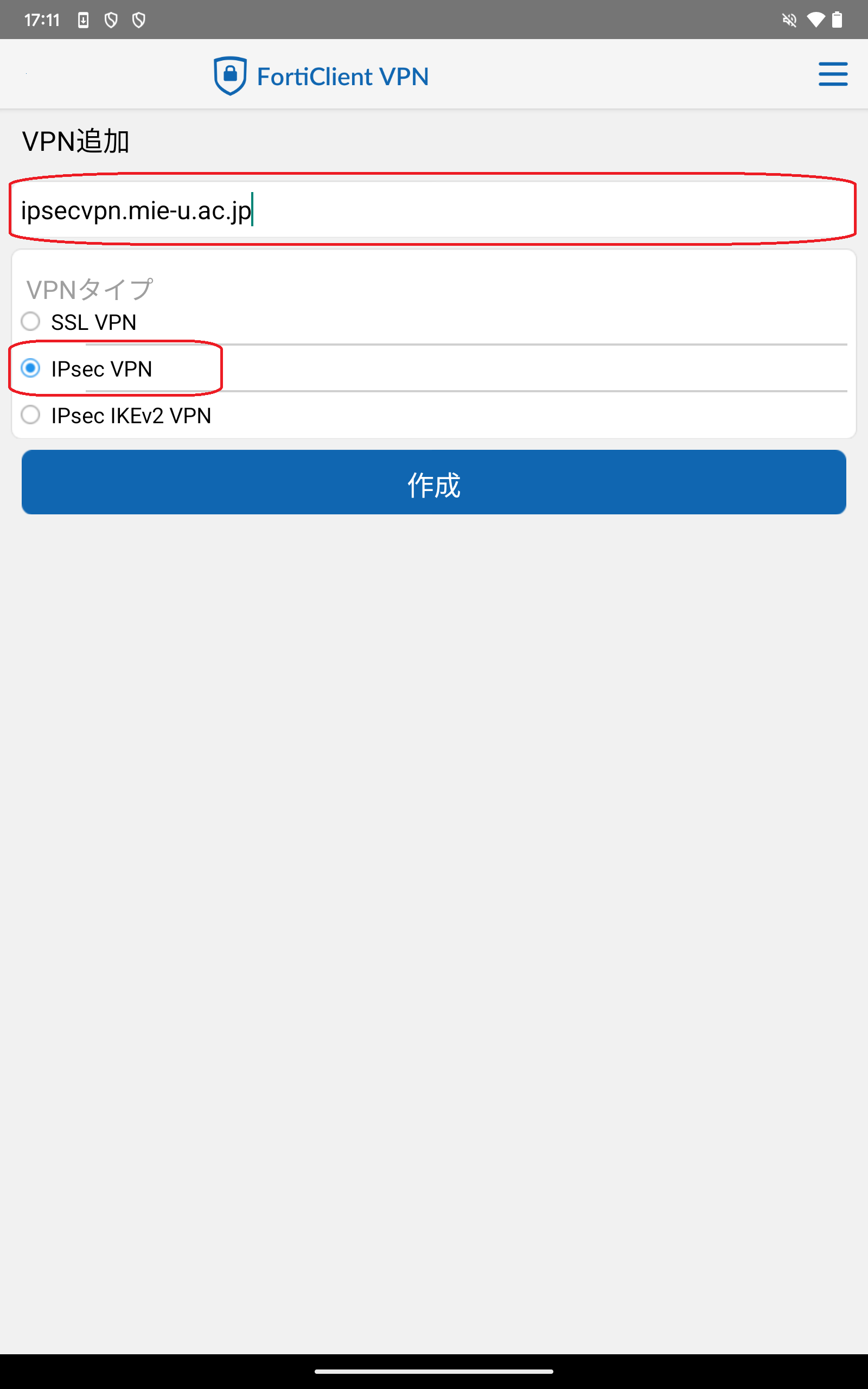 - VPN追加画面で下記を入力して、「作成」をタップしてください。