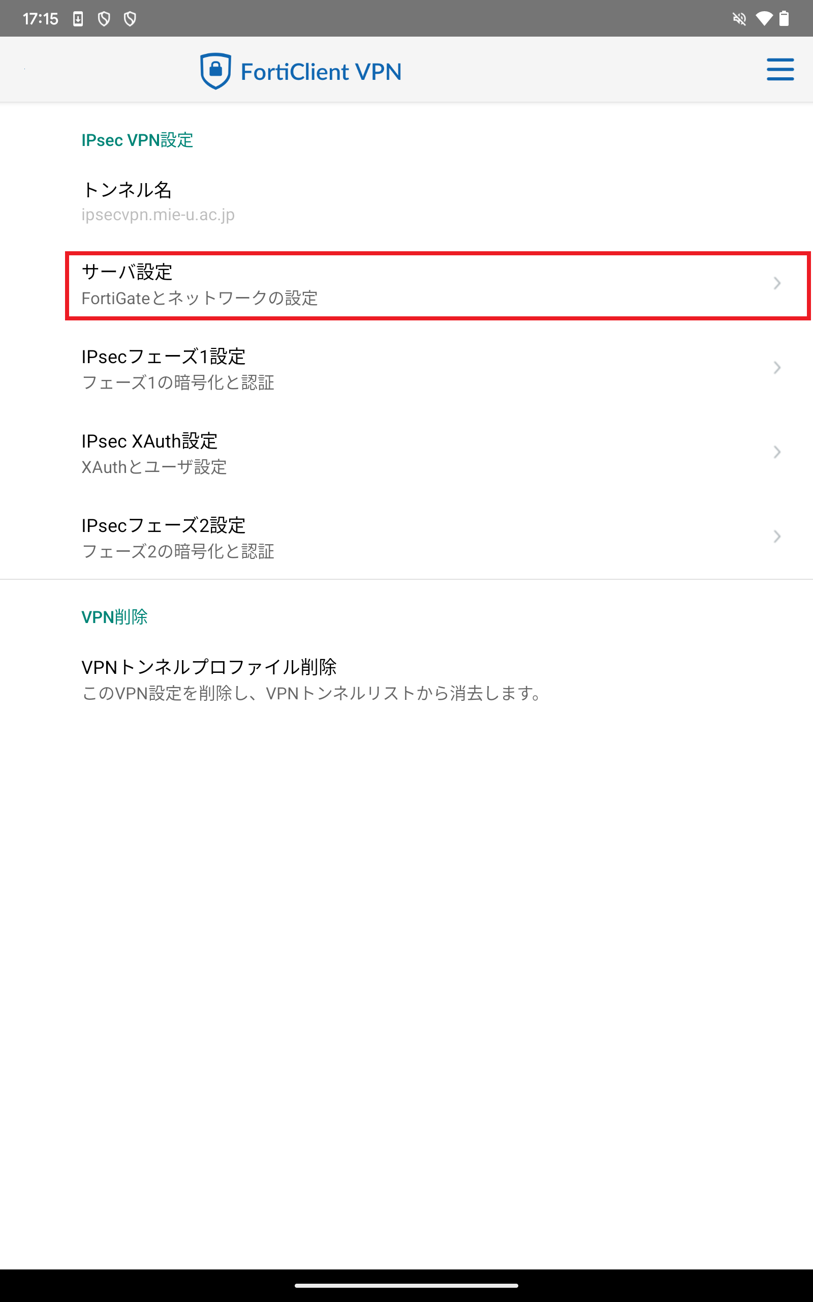 - VPNトンネル「ipsecvpn.mie-u.ac.jp」を選択してください。