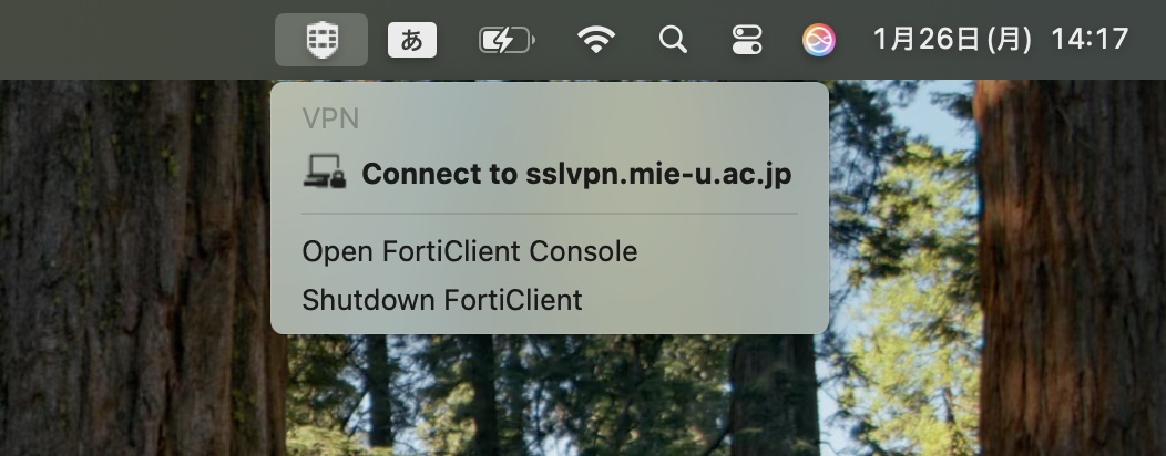 - インストールが完了後、右上にFortiClient VPNのアイコンが表示されます。