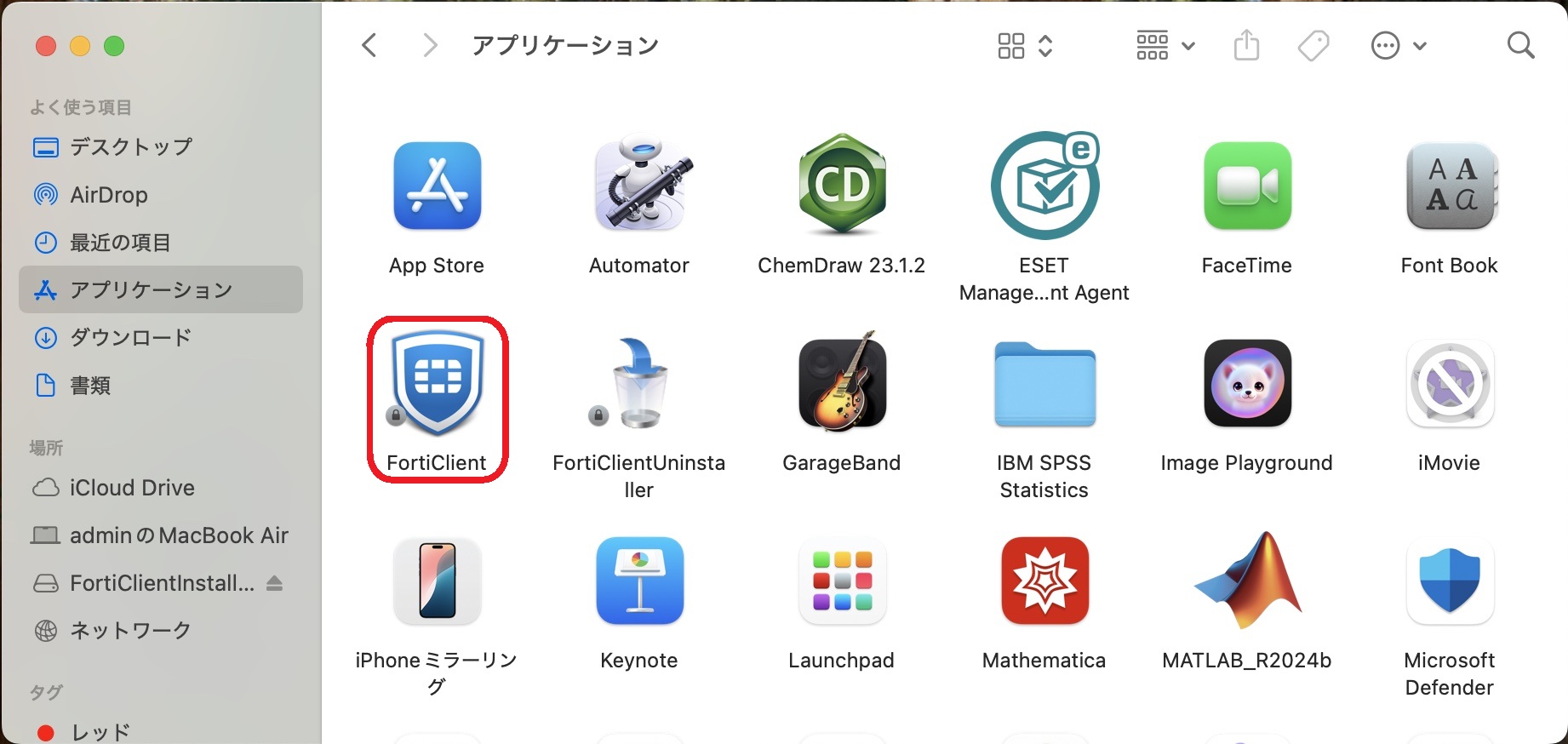誤って閉じてしまった場合は、アプリケーションフォルダの中に、FortiClient がありますので、そちらを実行して再度開いてください。