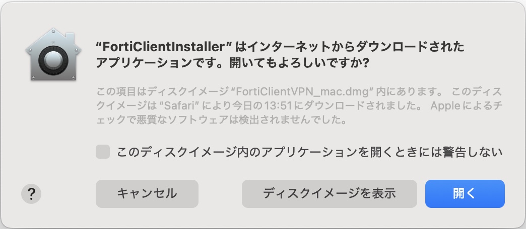 - 「"FortiClientInstaller"はインターネットからダウンロードされたアプリケーションです。開いてもよろしいですか?」と表示されます。「開く」を押してください。