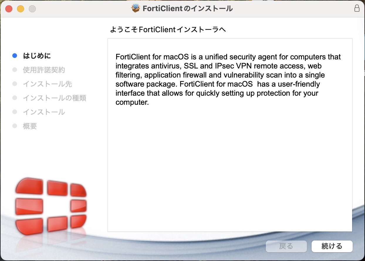 ※公式ページからのダウンロードはこちら - ダウンロードしたdmgファイルを開くと下記のような画面になります。「FortiClientInstaller」をクリックしてください。