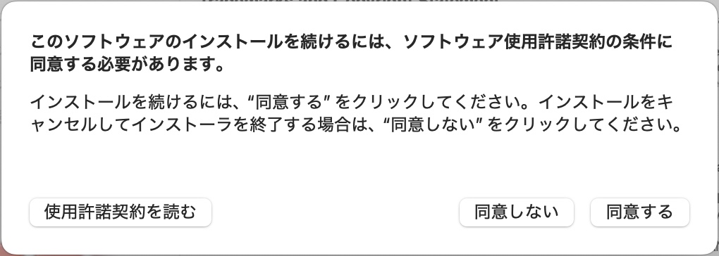 - License Agreement を読み、「続ける」/「同意する」を押してください。