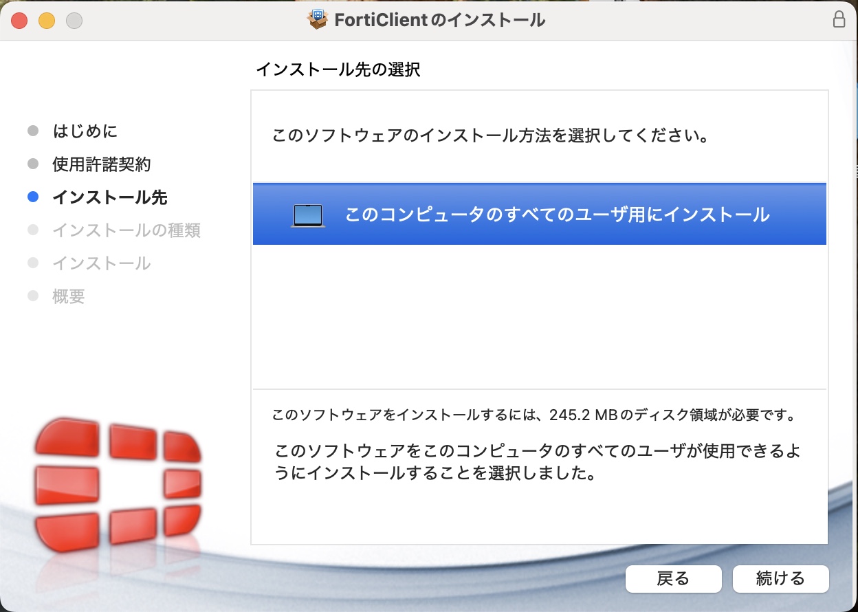 - インストール先は「このコンピュータのすべてのユーザ用にインストール」を選択し、「続ける」を押してください。