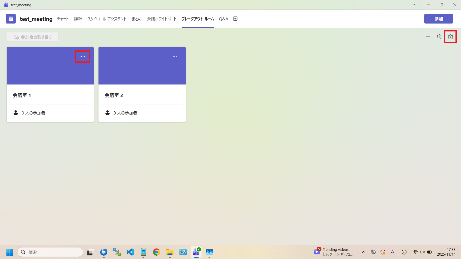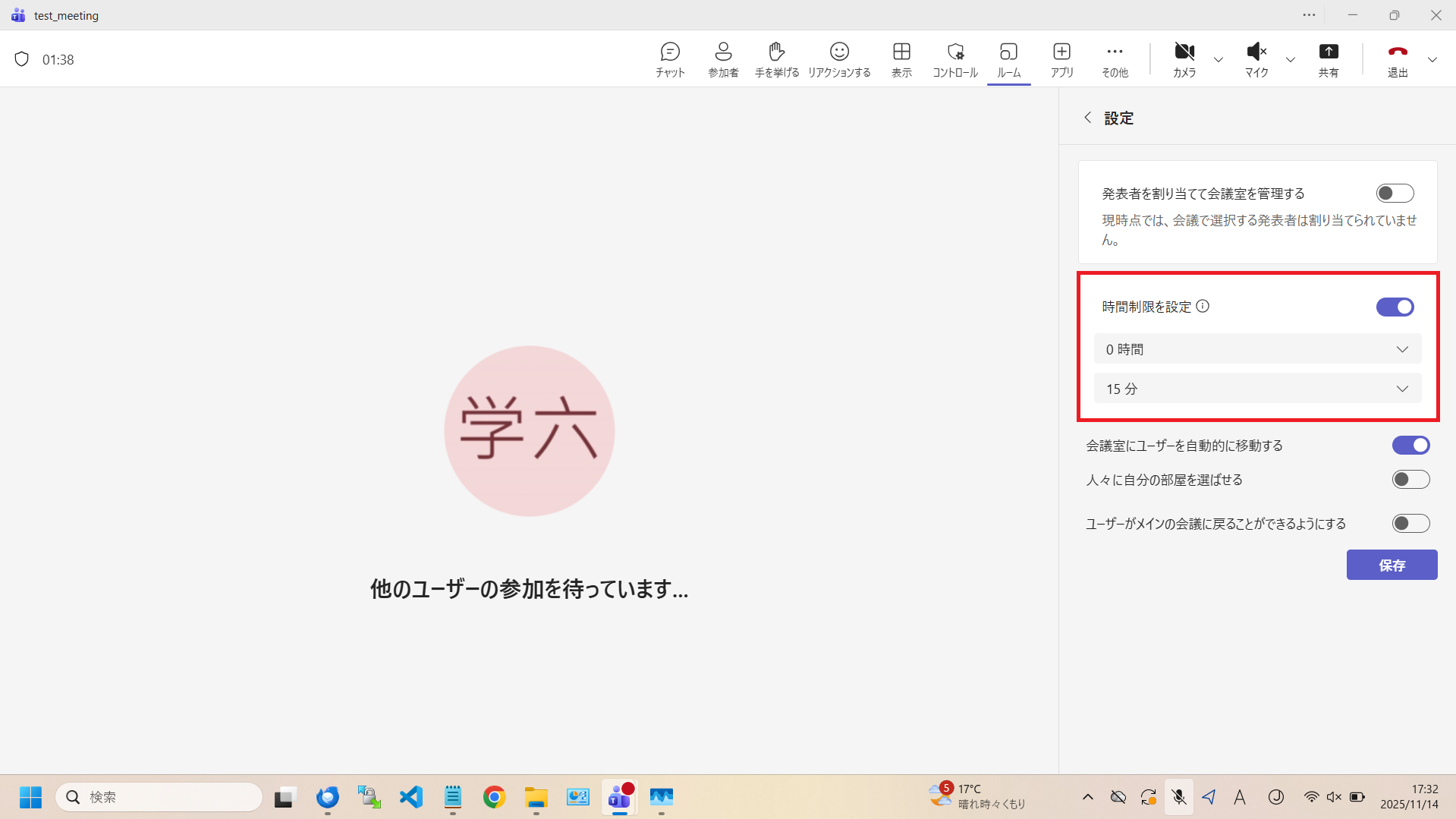 - ブレークアウトルームに時間制限を設けることには、「会議室の設定(歯車アイコン)」を選択し、時間を設定します。