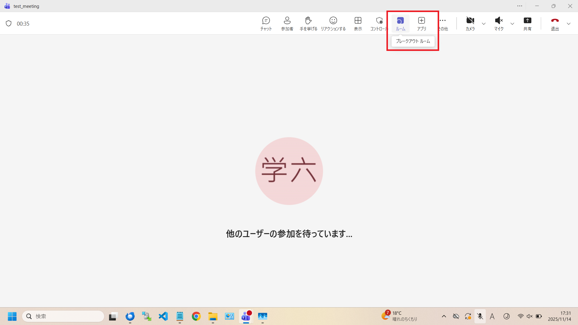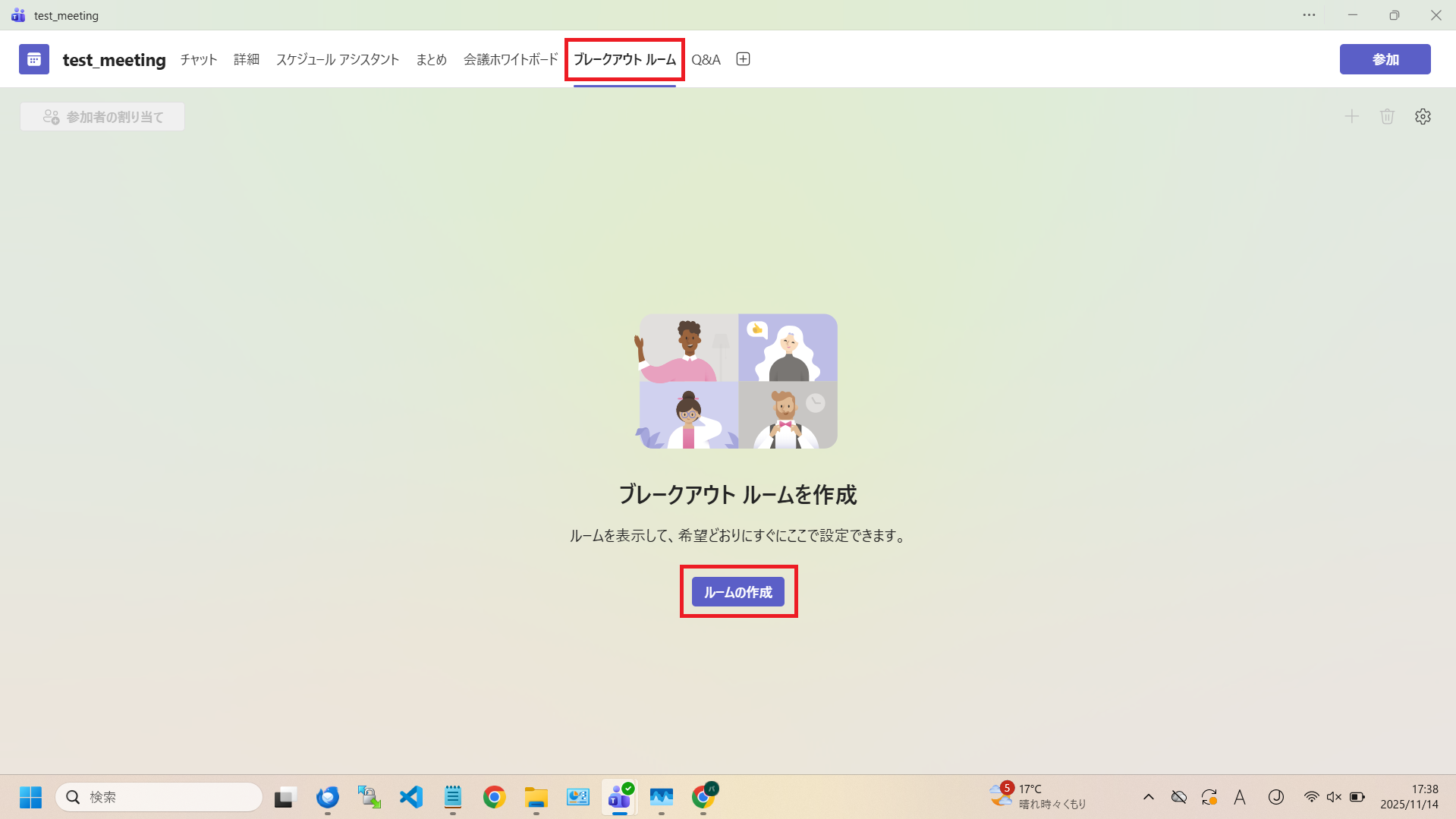 - 画面上のメニューから『ブレークアウト ルーム』を選択し、『ルームの作成』をクリックします。