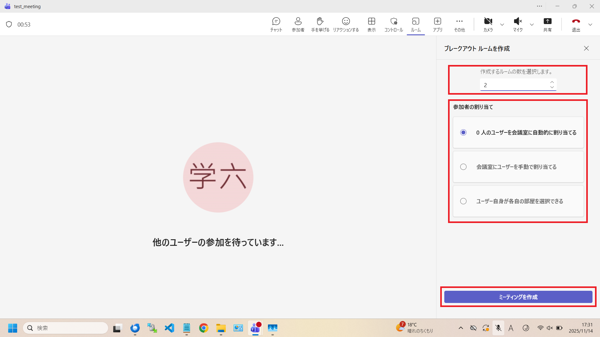a. 必要なルームの数(最大50)を選択します。b. 会議室にユーザーを割り当てる方法を選択します。自動または手動での割り当て方法を選択します。 - 『ミーティングを作成』をクリックします。