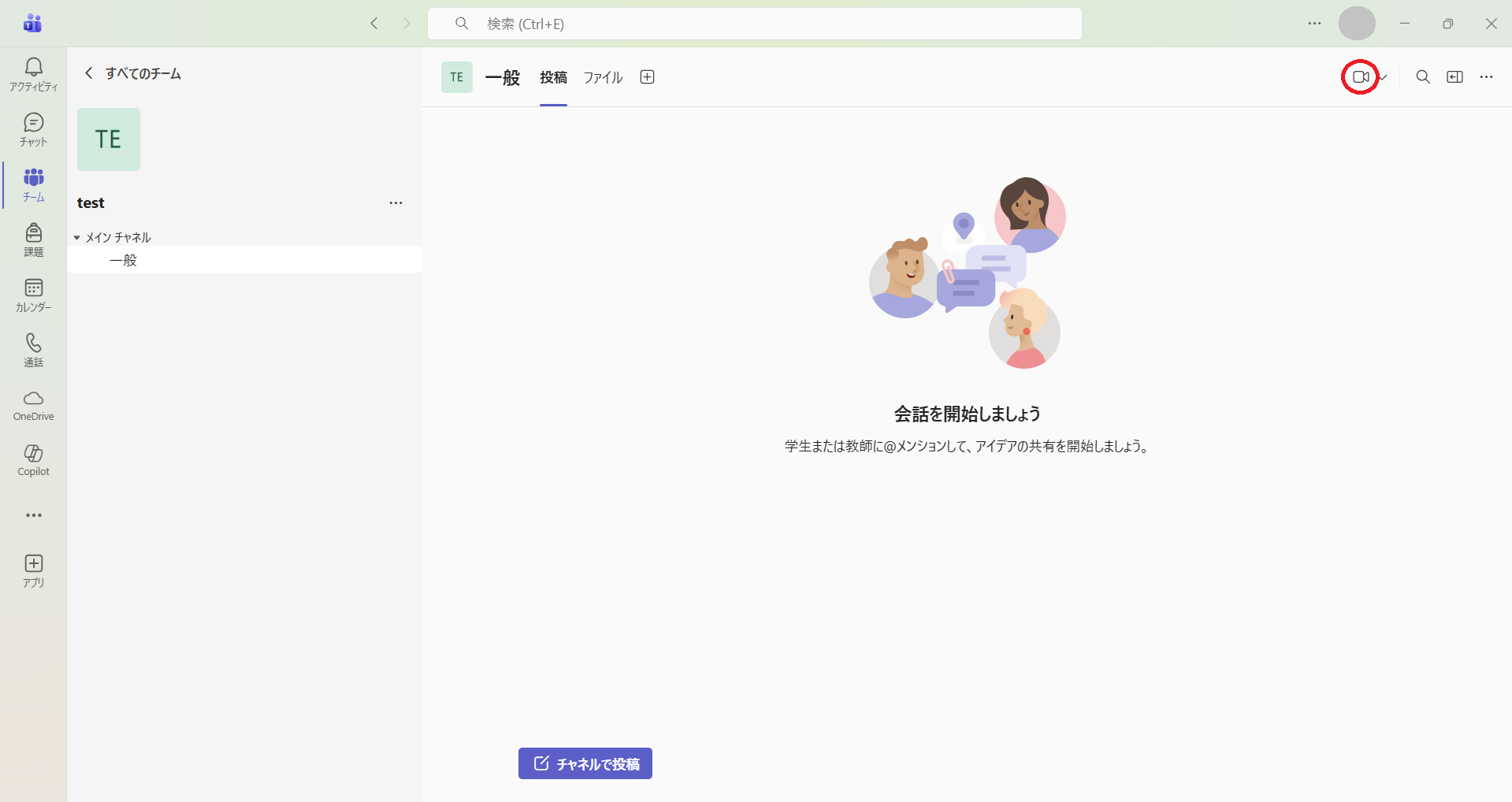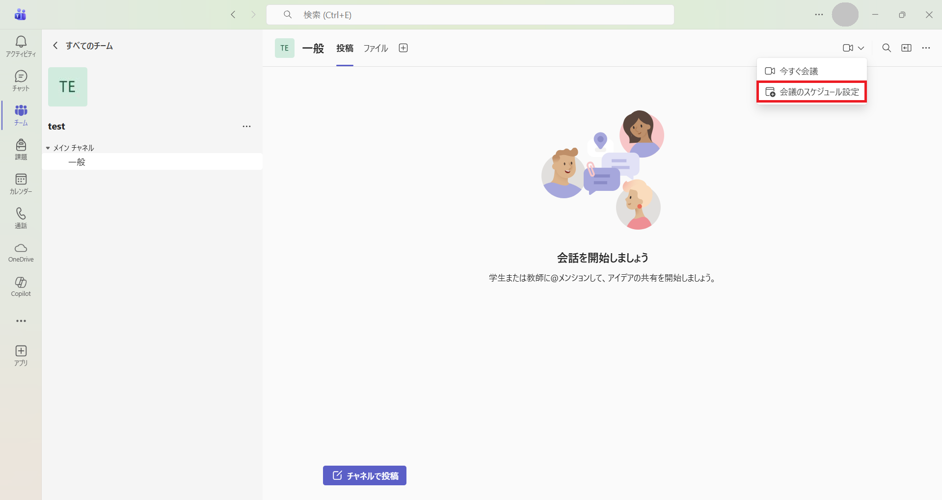 - 画面右上の「カメラマーク」の右側にある「▽」をクリックし、「会議をスケジュール設定」を選択してください。