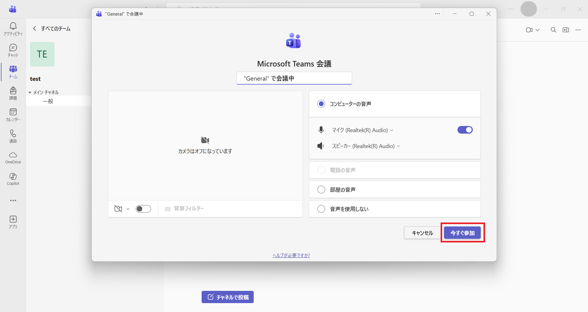 - 会議用の新しい画面が表示されます。今すぐ参加をクリックしてください。会議が開催されます。