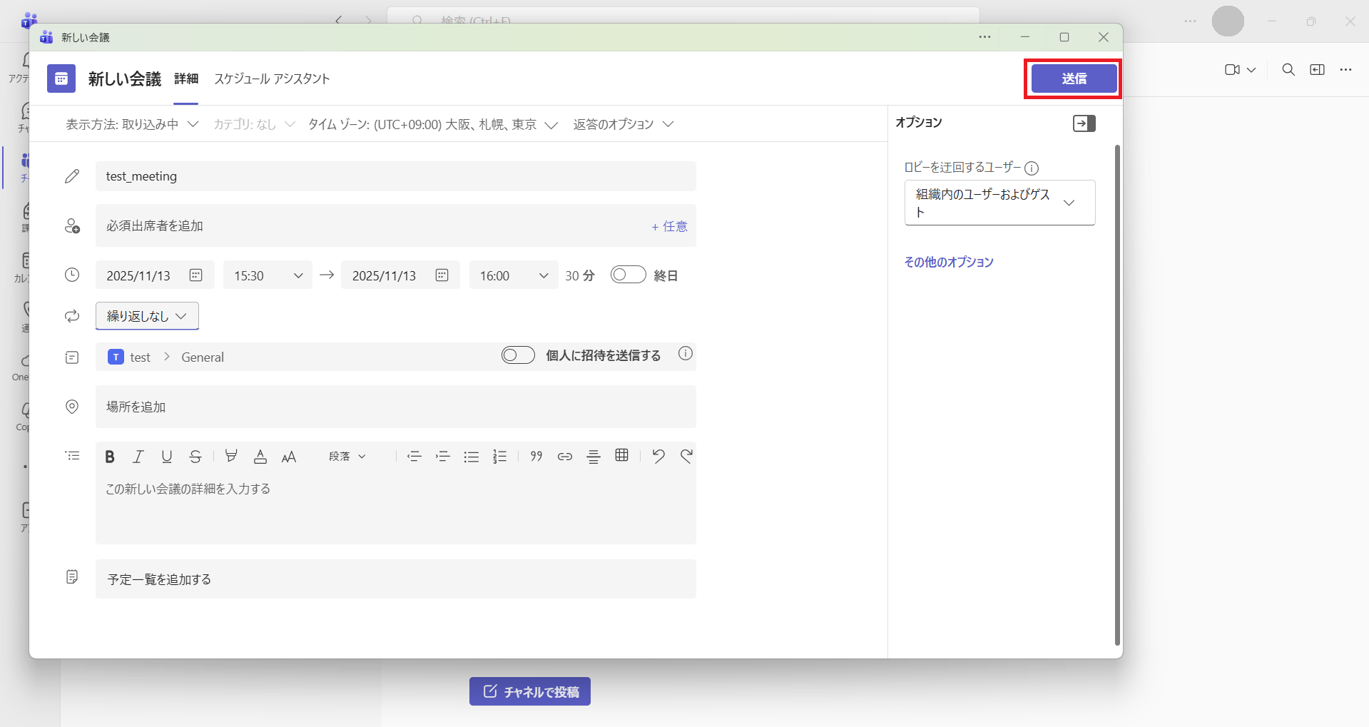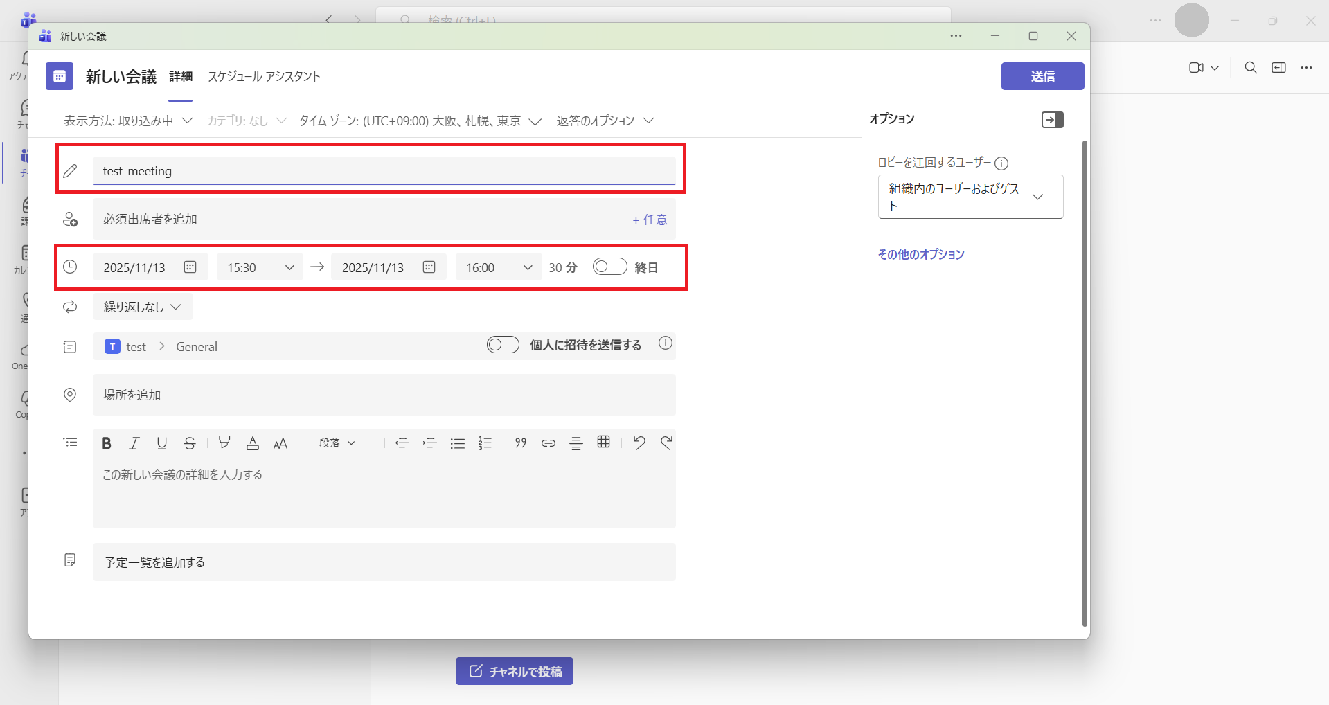 - 会議の名前を付けて、会議の開始時刻を設定し、「送信」をクリックしてください。