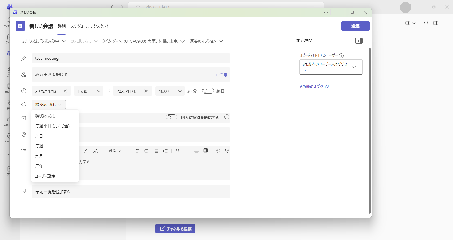 - 繰り返し会議を行う場合は、「繰り返しなし」のところを選択し、毎日行うのか、毎週行うのかを選択してください。
