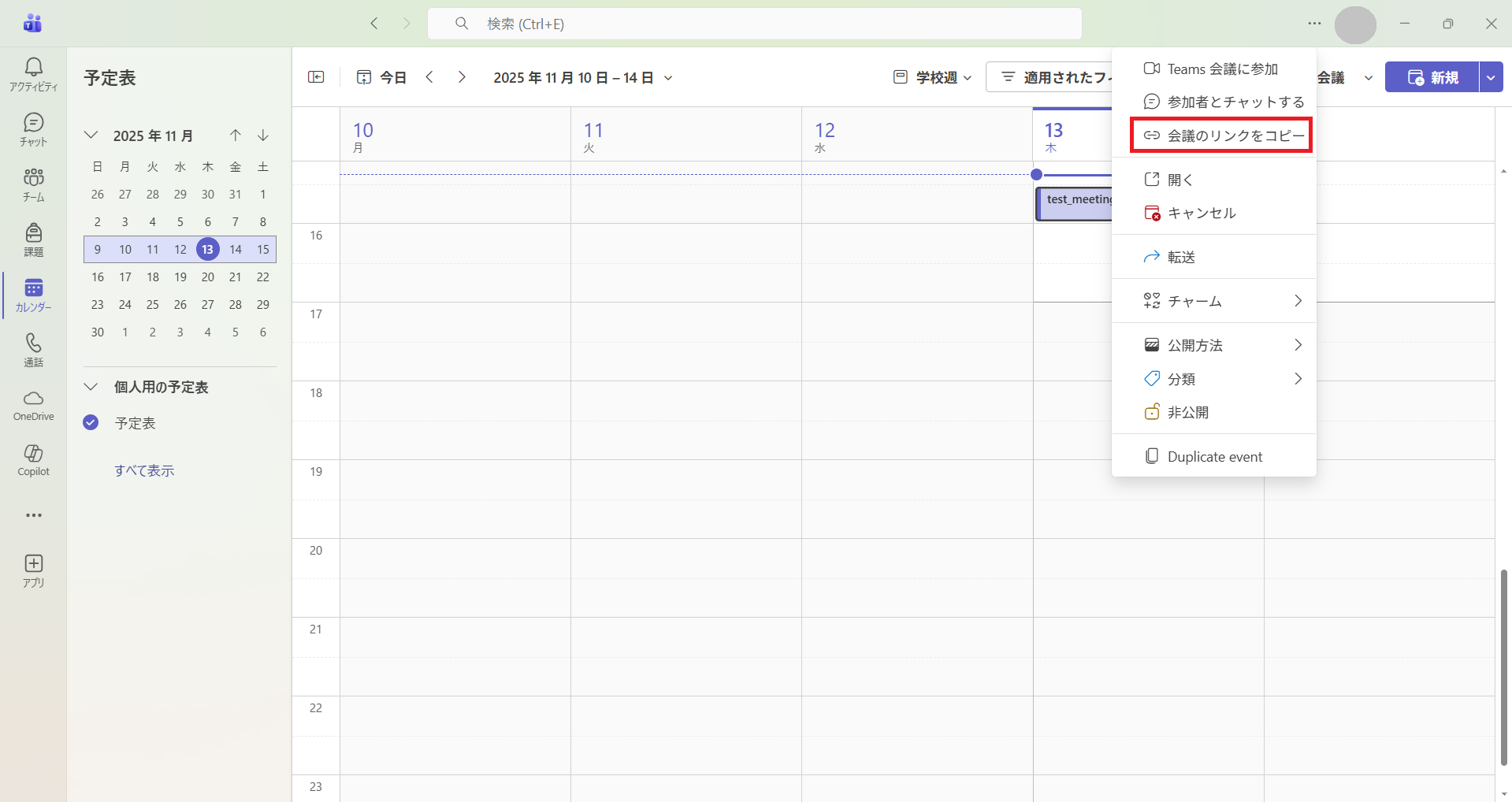 - 会議の部分をクリックし、「会議のリンクをコピー」を選択すると、URLがコピーされます。