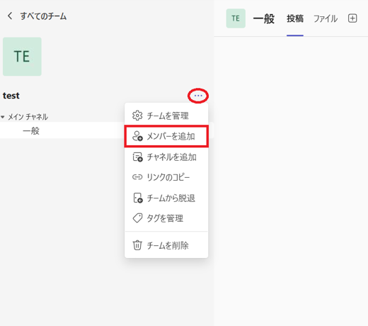 チームの名前の隣にある「…」の部分をクリックして、「メンバーを追加」を選択してください。
