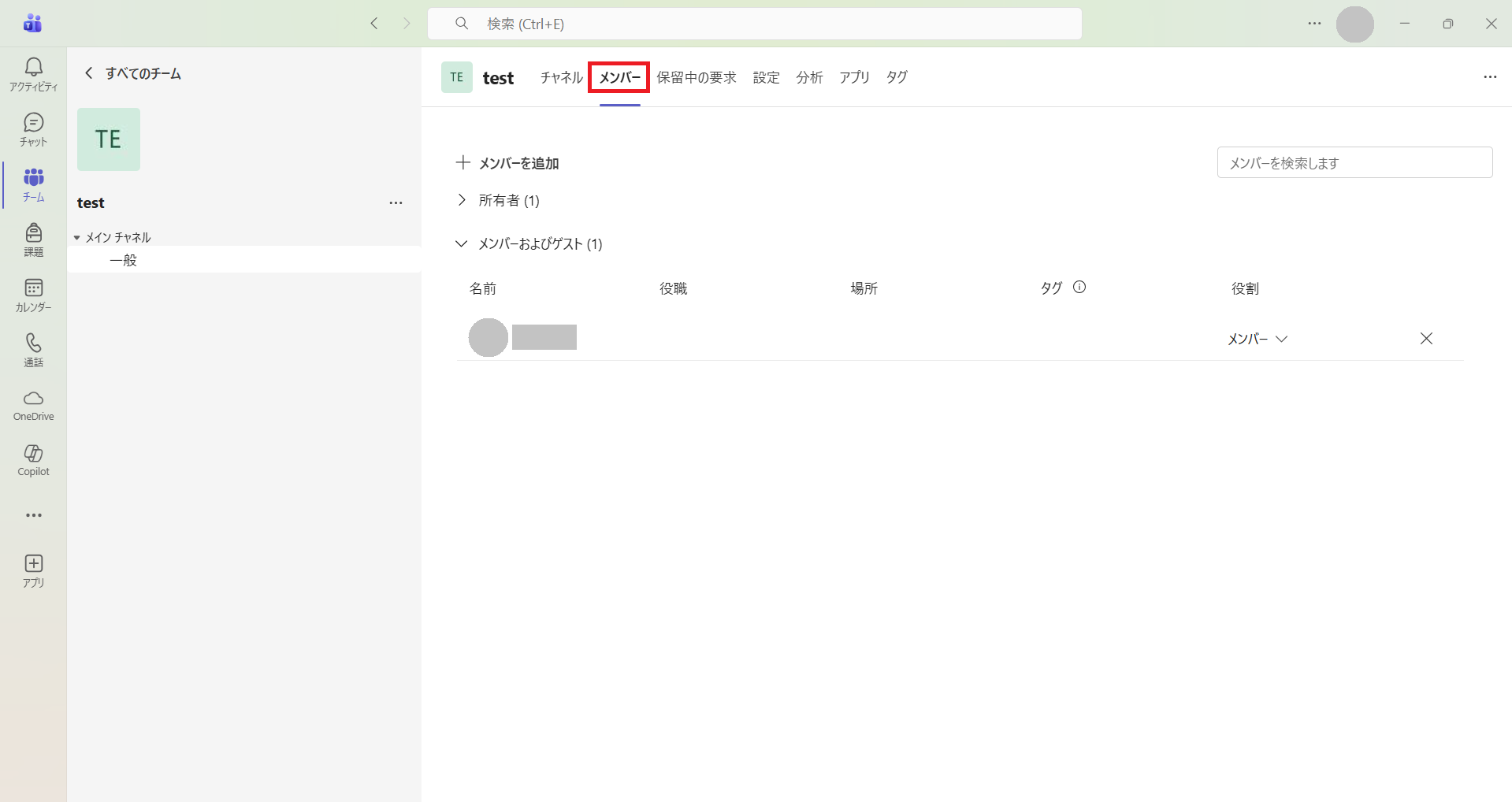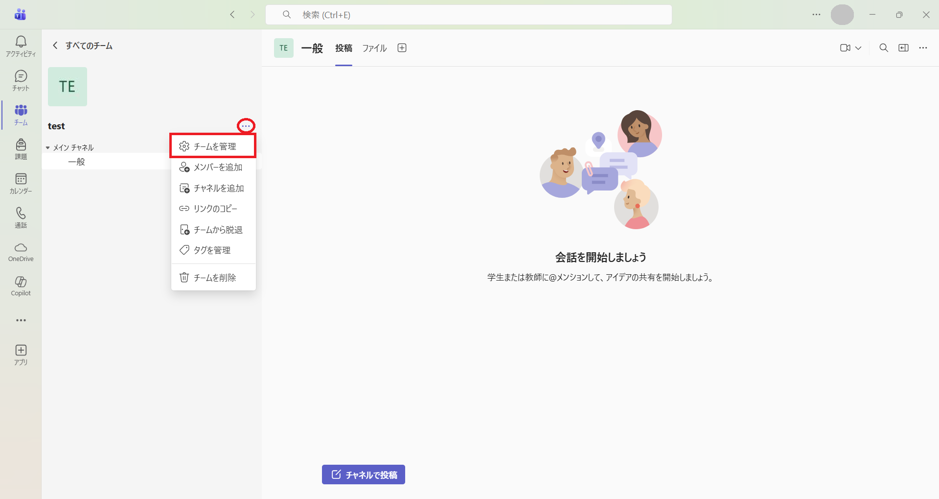 赤枠の「…」の部分をクリックして、「チームを管理」を選択してください。