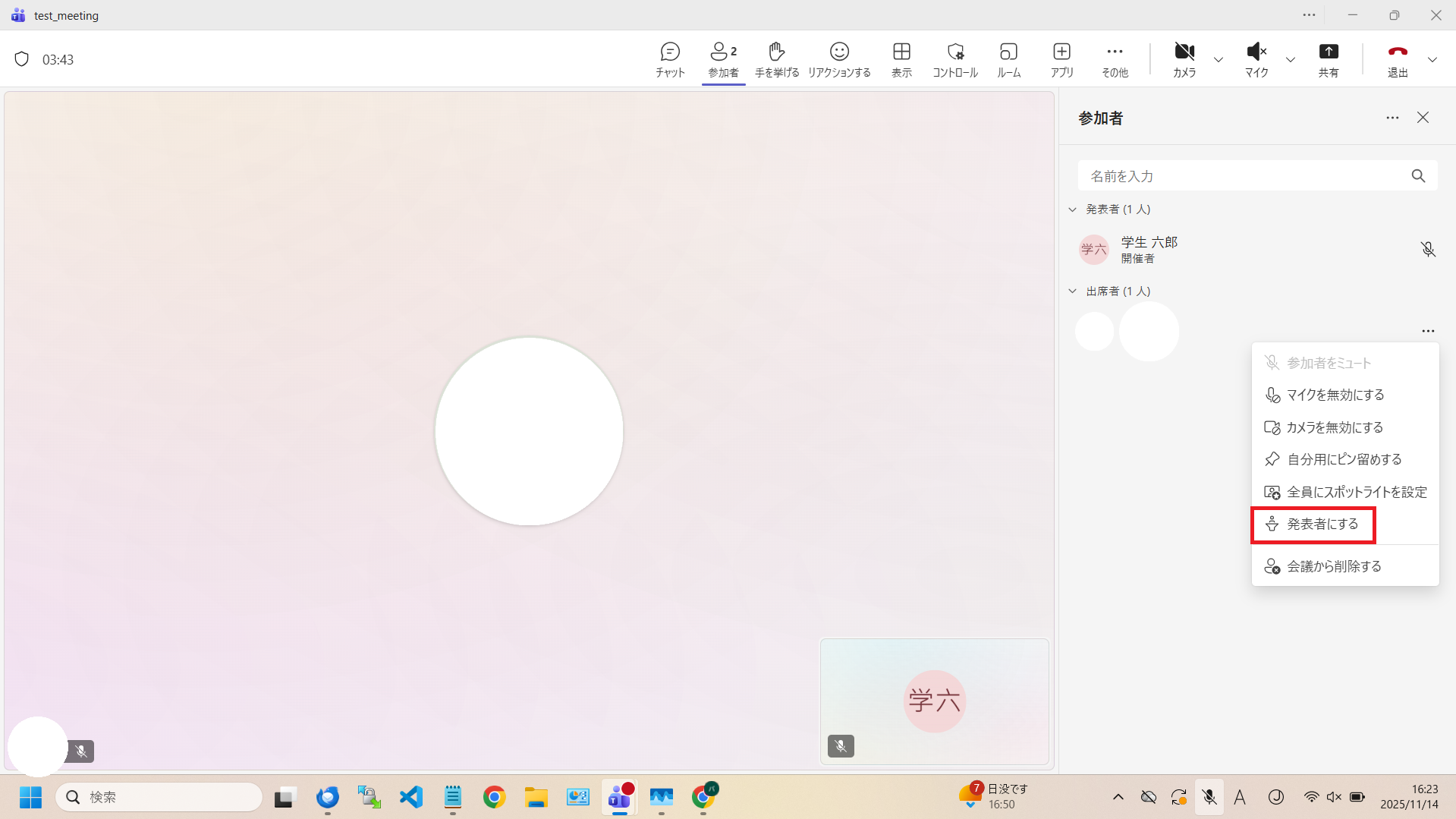 - もう一度画面の共有を許可したい場合は、「発表者にする」をクリックしてください。