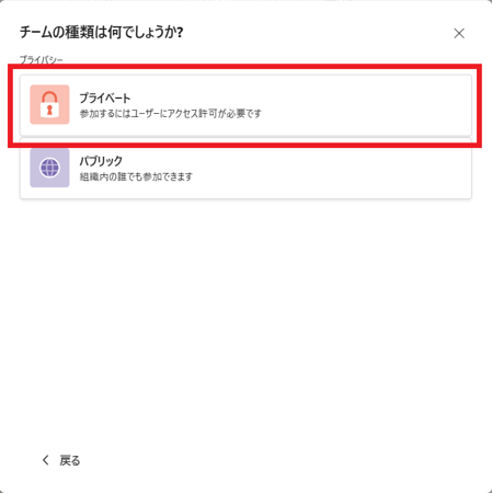 パブリックを選択すると、だれでも参加できるようになってしまいます。