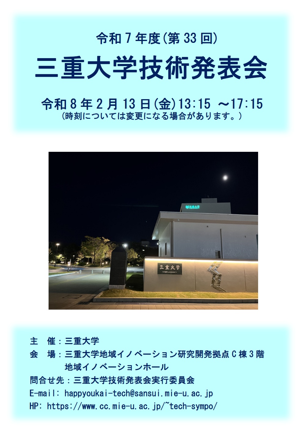 このたび、三重大学の技術職員の特別研修の一環として、令和7年度三重大学技術発表会(第33回)を実施させていただきます。